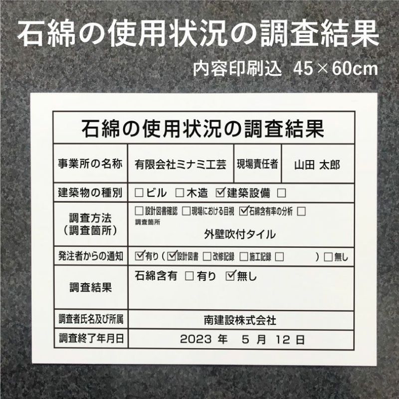 石綿標識 アスベスト対策 石綿対策 屋外対応 アルミ複合板 3mm 【内容印刷代込み】 石綿の使用状況の調査結果 asbestos45