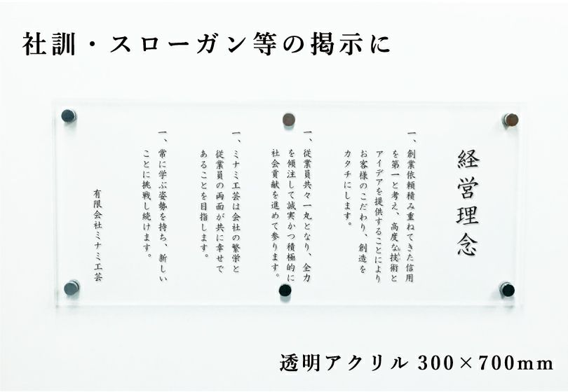 他の画像を見る 会社・企業・学校に。透明アクリルでお洒落に掲示。 透明アクリル 社訓 自立 acryl-3-7-motto-jiritu 送料無料 デザイン自由 ¥ 37,400 税込 会員特別価格 ¥ 35,530 税込 (0件) 詳細を見る お気に入りに登録する