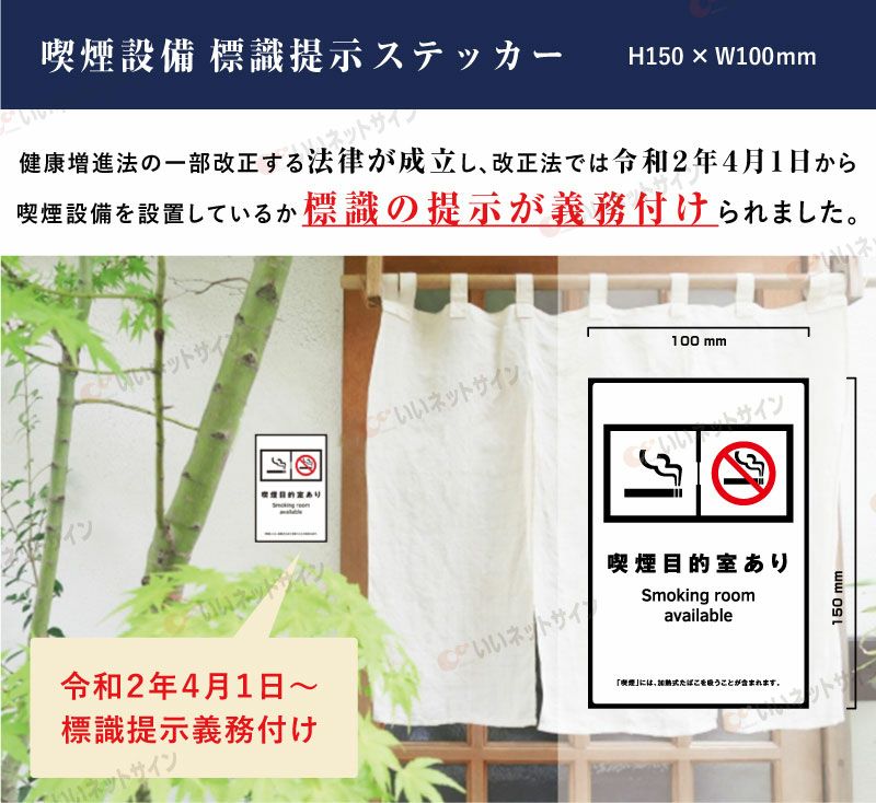 他の画像を見る 令和2年4月1日喫煙設備設置の標識提示が義務付け。受動喫煙対策 喫煙目的室あり 標識提示プレート kin-5 ¥ 2,607 税込 会員特別価格 ¥ 2,476 税込 (0件) カートに入れる お気に入りに登録する