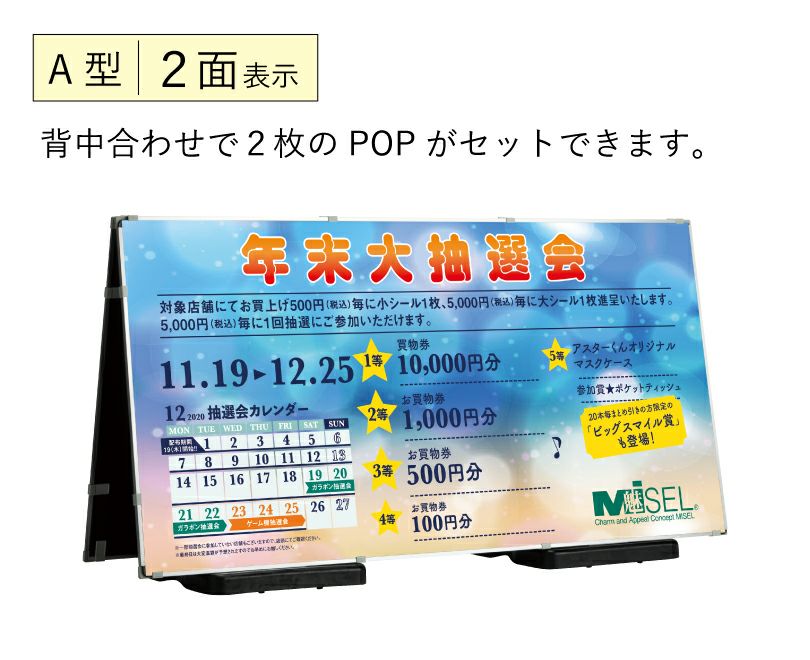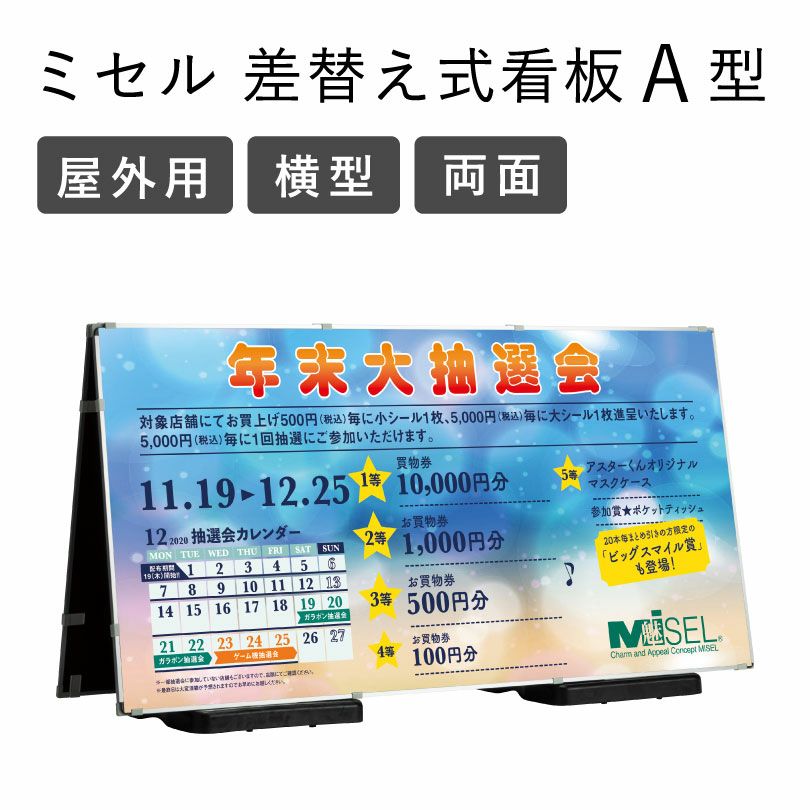 他の画像を見る 案内表示を差し替えて使える大型・軽量の看板です ミセル差替え式看板 A 型 ot-569-471-7 送料無料 屋外 両面 デザイン自由 ¥ 191,070 税込 会員特別価格 ¥ 181,516 税込 (0件) 詳細を見る お気に入りに登録する
