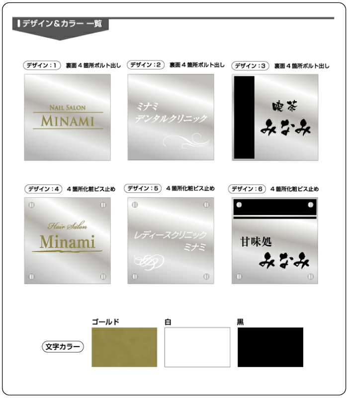 他の画像を見る 文字が輝いて見える高級感のある表札。会社、飲食店、マンション等に。 会社表札 フォグラスシート H200×W200mm H200×W400mm office-foglas 屋外 デザイン多数あり ¥ 14,190 税込 〜 ¥ 税込 (0件) 詳細を見る お気に入りに登録する