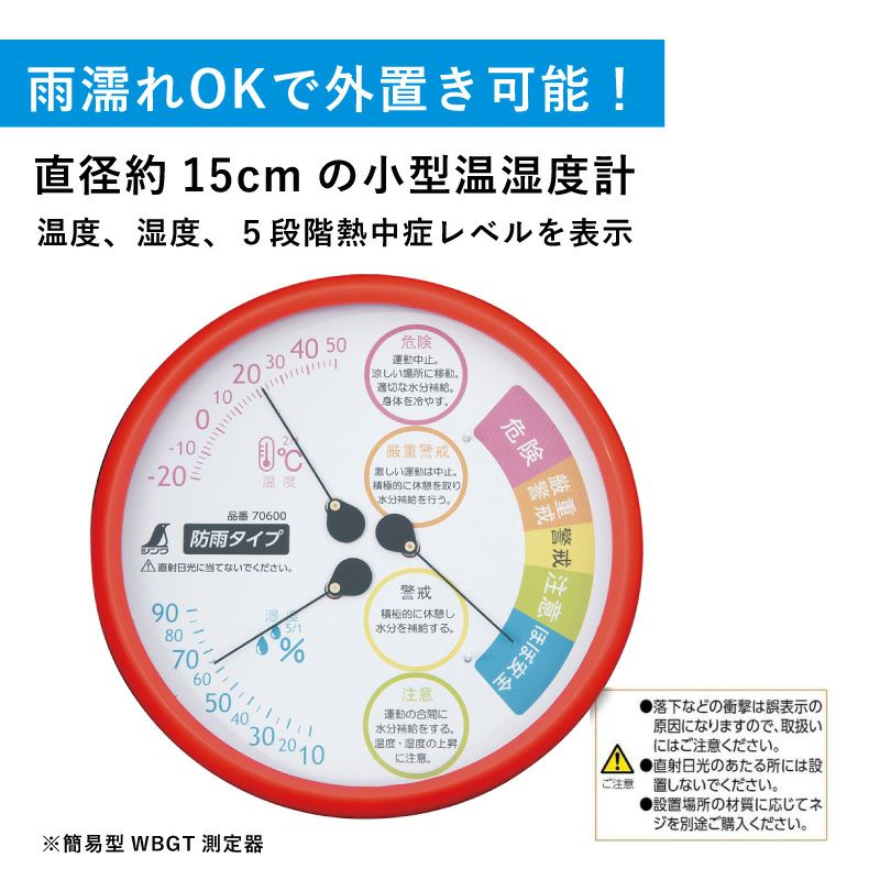 他の画像を見る 屋外使用に適した防雨型。WBGT温室度計、対応表付き。 【完売】WBGT値チェック表 温湿度計付 防雨型 H600×W450mm un-HO-515C ¥ 8,965 税込 会員特別価格 ¥ 8,516 税込 在庫切れ 詳細を見る お気に入りに登録する