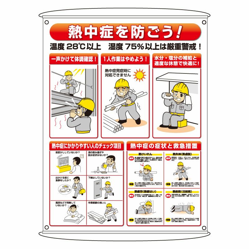 他の画像を見る 4つの熱中症標識が1枚のシートに。取付簡単。 熱中症を防ごう マルチサインシート 横断幕 H900×W1800mm un-HO-581 ¥ 11,000 税込 会員特別価格 ¥ 10,450 税込 詳細を見る お気に入りに登録する