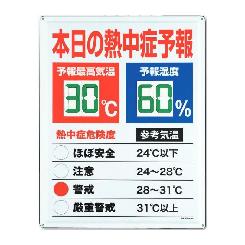 他の画像を見る 熱中症予防情報標識。日付部は水性ペンで書き消し可能。 熱中症予防標識 ホルダ付標識5枚セット H600×W450mm un-HO-1021 ¥ 23,430 税込 会員特別価格 ¥ 22,258 税込 詳細を見る お気に入りに登録する
