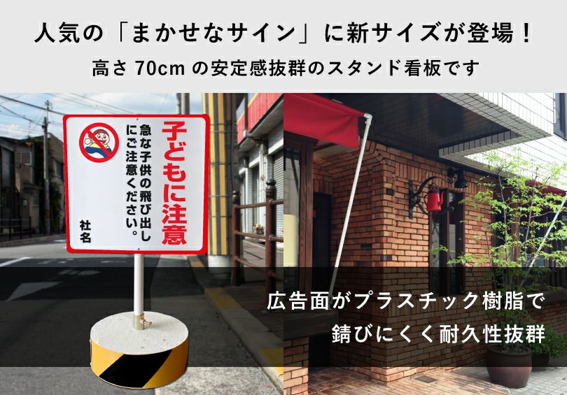 他の画像を見る 屋外対応 樹脂面広告の看板 コンクリートブロック付き まかせなサイン Cタイプ 子どもに注意 os-c-32 屋外 両面 ¥ 18,810 税込 会員特別価格 ¥ 17,869 税込 詳細を見る お気に入りに登録する
