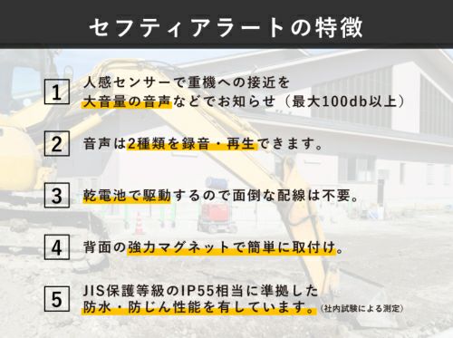 他の画像を見る 作業員に重機への接近を音声で警告して接触事故を防ぐ セフティアラート 音声警告器 人感センサー un-398-5 送料無料 ¥ 27,500 税込 会員特別価格 ¥ 26,125 税込 カートに入れる お気に入りに登録する