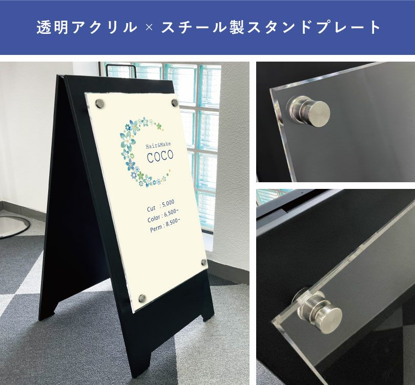 他の画像を見る 美容室、飲食店、レストランにも。メニューボードや店舗看板として スチール製スタンドプレート SP-steel-acrylic 送料無料 屋外 片面 デザイン自由 ¥ 32,670 税込 会員特別価格 ¥ 31,036 税込 詳細を見る お気に入りに登録する
